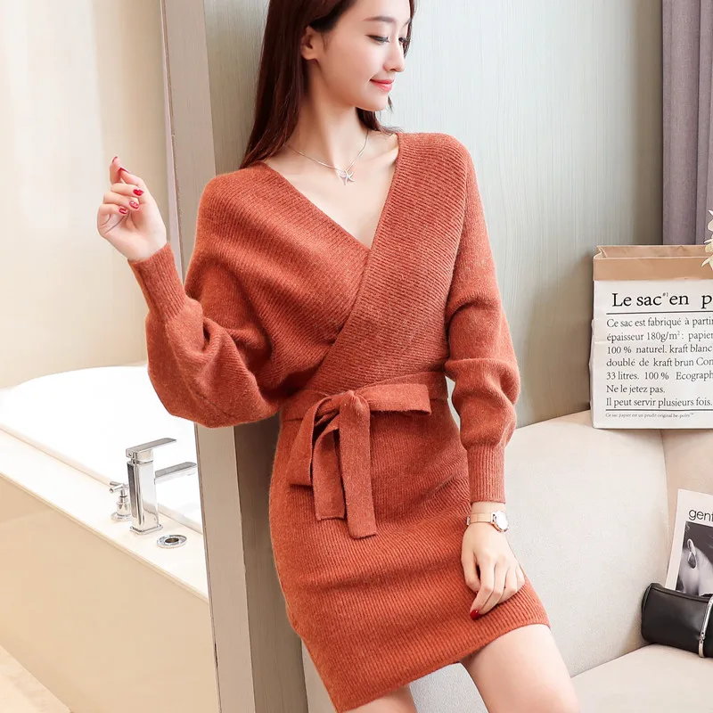 Fall / Winter 2021 Sexy V-neck Lace Up Long Sleeve Women's Dress Fashion New Lace Up Long Sleeve Women's Sweater Dress