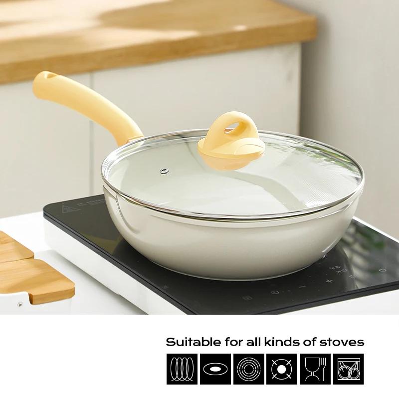 5 размеров антипригарная керамическая кастрюля прочная сковорода вок с крышкой индукционная газовая плита сковороды для омлета стейк-стейк сковорода кухонная утварь 30cm жёлтый