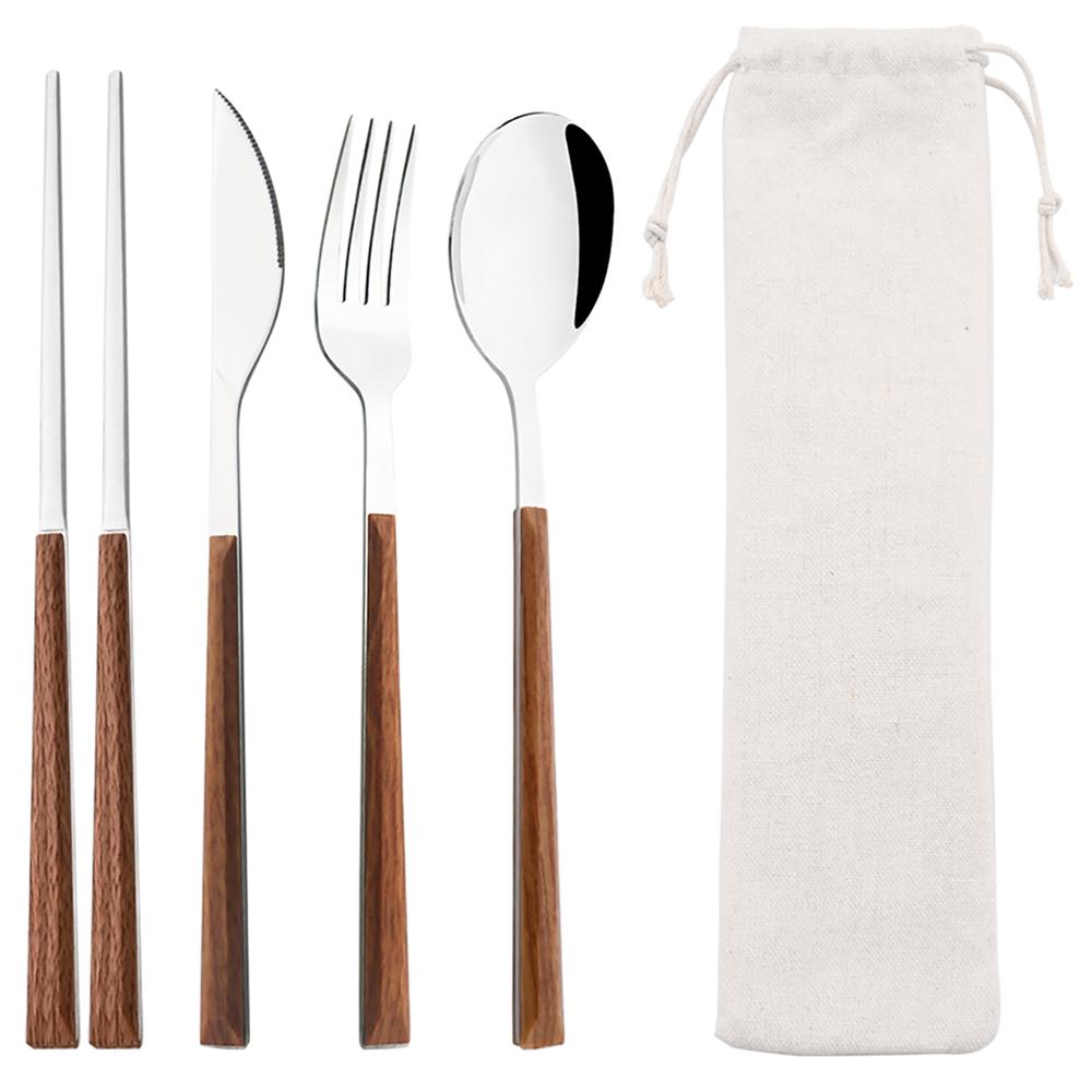 5 шт., набор столовой посуды с деревянной ручкой, посуда из нержавеющей стали, нож, вилка, ложка, палочки для еды, столовые приборы, кухонные столовые приборы с дорожной сумкой серебряный