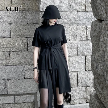 VGH Black Asymmetrical Casual T Shirts For Women O Neck Short Sleeve Patchwork Shirt Blouse Tops Female 2020 Summer Fashion New