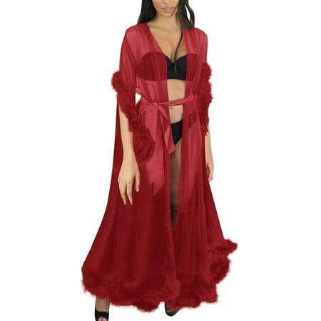 Women Fashion Tulle Robe Long Lingerie Nightgown Bathrobe Sleepwear Feather Bridal Robe Lace Lingerie Honeymoon Lingerie plus