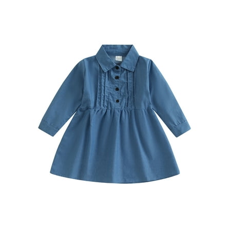 Canrulo Toddler Baby Girls Casual Spring Fall Dress Button Long Sleeve Turn Down Collar Tunic A-line Dresses Blue 3-4 Years