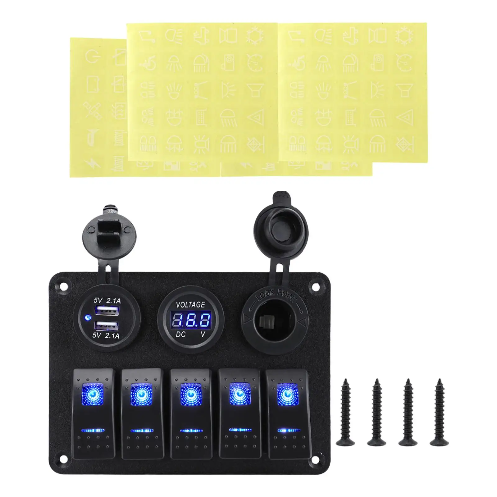5 Gang Aluminum Plastic Marine Rocker Switch Panel Overload Protection LED Voltmeter for Car RV Truck Boat Power Control