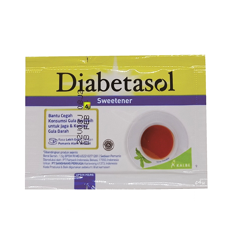 Seiring meningkatnya kesadaran masyarakatakan kesehatan, bermunculan produk2 mutakhir penunjang gaya hidup sehat masyarakat tsb. Salah satu bidang yg dibanjiri adalah produk pengganti gula, yg satu dari sekian faktor yg dituding menjadi penyebab berbagai gangguan kesehatan. Juga animo masyarakat mengenai menurunnya kualitas dari gula2 saat ini itu sendiri. Satu diantaranya adalah DIABETASOL Sweetener, produksi PT. Fairpack Indonesia-Bekasi untuk PT. Sanghiang Perkasa - Karawang. Satu Grup dari raksasa farmasi Kalbe Indonesia. Pemanis ini, terdiri dari bahan2 yg sudah di riset dan lolos uji klinis yg dapat membantu mencegah konsumsi gula berlebih yg dapat berujung ke berbagai penyakit seperti diabetes. Dikemas dalam sachet2 kecil bernetto 1.5 gr, dimana dalam 1 sachetnya setara dgn 2 sendok teh gula biasa. Mengandung pemanis alami sorbitol yg banyak digunakan industri kesehatan, juga pemanis buatan seperti sukralosa serta bahan2 lain termasuk pati jagung. Untuk hal konsumsi, Diabetasol ini kadar kemanisannya tidak akan berubah dalam suhu tinggi. Sehingga sangat cocok utk pemanis pengganti gula di semua minuman anda seperti teh, kopi, dll. Berkalori sangat rendah, tanpa garam, tanpa protein, tanpa lemak jenuh. Sobat para penderita Diabetes! Beratribut lengkap BPOM RI dan Halal MUI, silahkan diorder. Dijual dalam kelipatan paket 5 sachet.