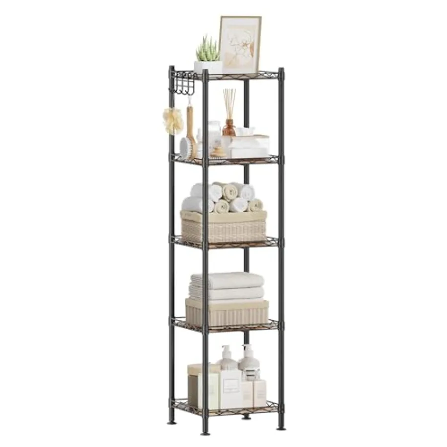 5-Tier Bathroom Shelf Storage Rack for Small Space PP Shelf Liners in Ink Black and Rustic Brown Removable Hook Extendable Desi