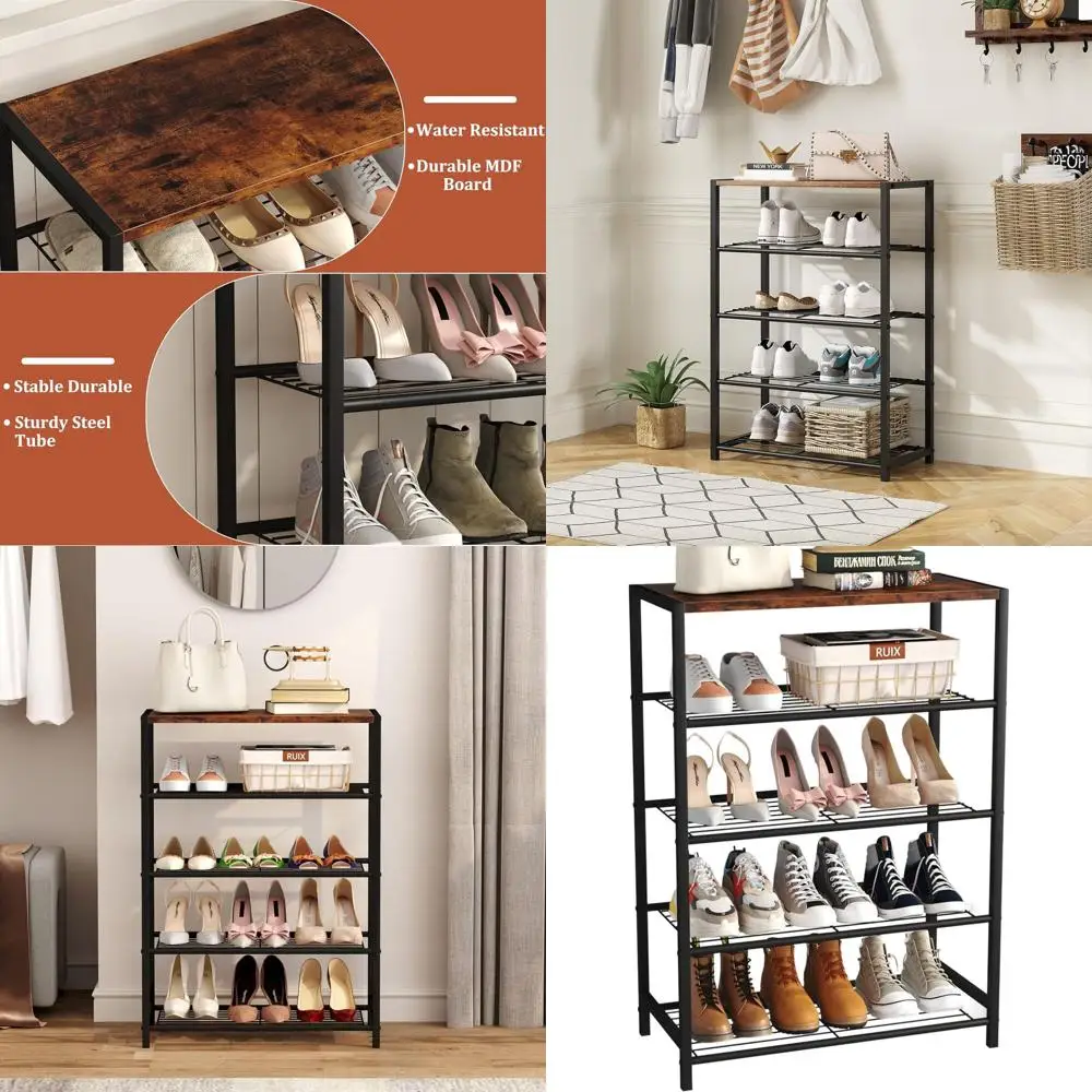 5-Tier Rustic Brown Metal Shoe Storage Rack for Closet and Entryway