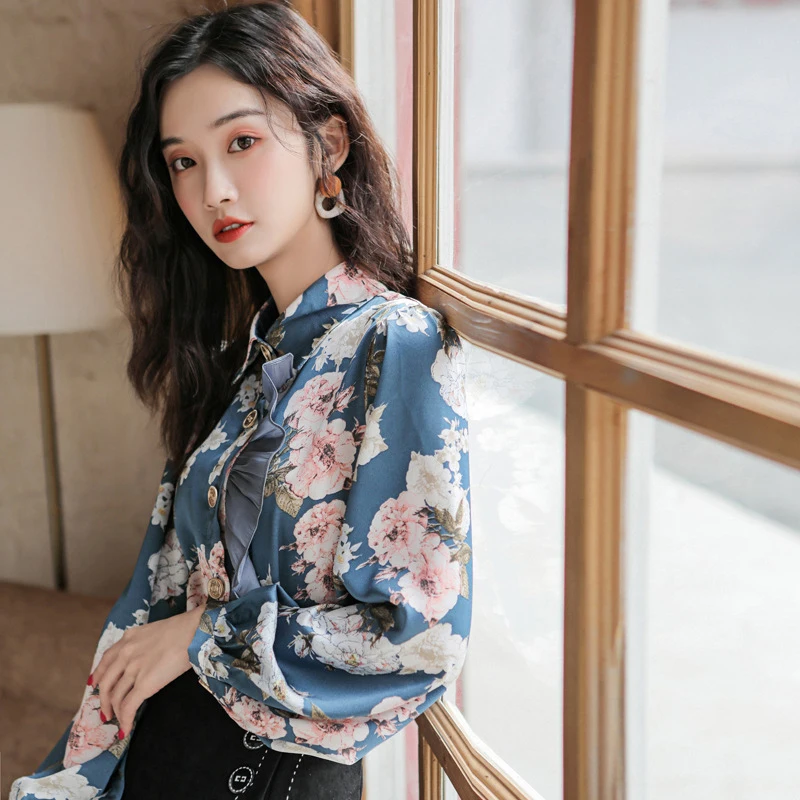 SISPELL Patchwork Ruffle Blouse Shirt For Female Lapel Collar Long Sleeve Print Hit Color Loose Womens Casual Shirt Fashion New