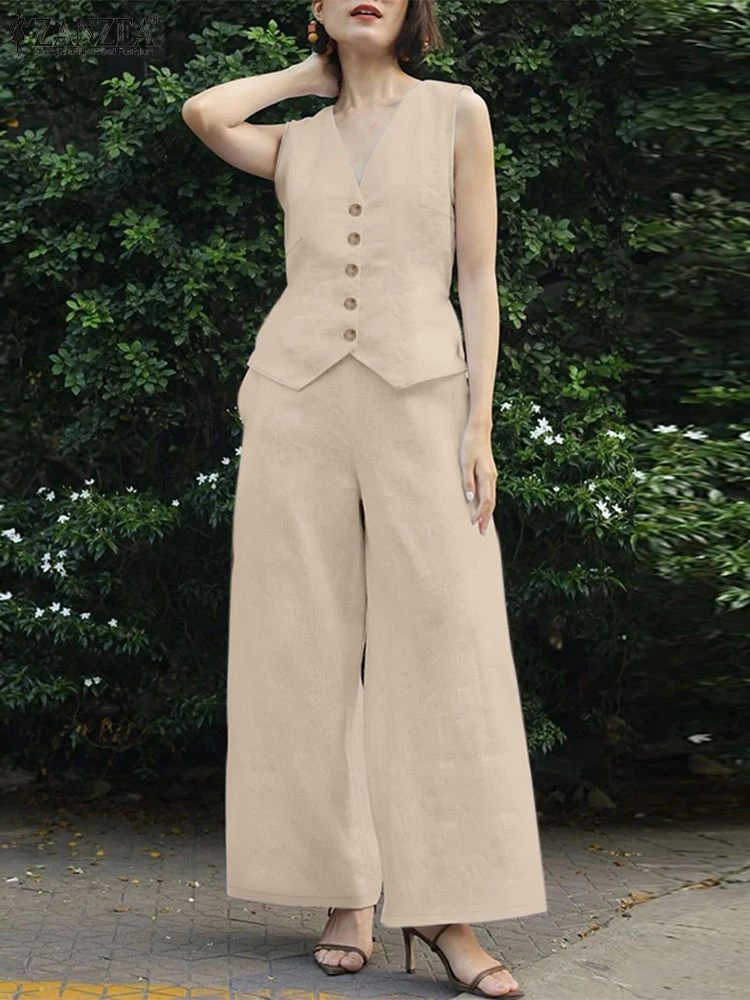 2025 ZANZEA Summer Elegant OL Work Pant Sets 2pcs Woman Outfits Fashion Trackusuits Sleeveless Vests Tops Wide Leg Trousers Suit