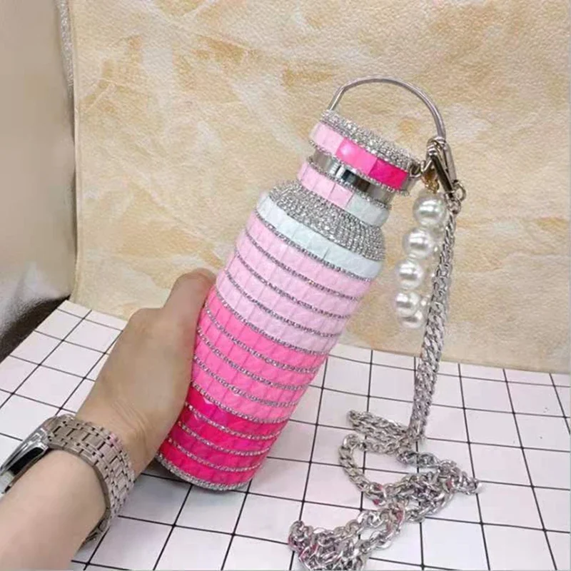 500 мл Мерцающая стеклянная Изолированная чашка из нержавеющей стали, портативные вакуумные фляжки с жемчужной цепочкой, бутылка для воды, блестящие термосы