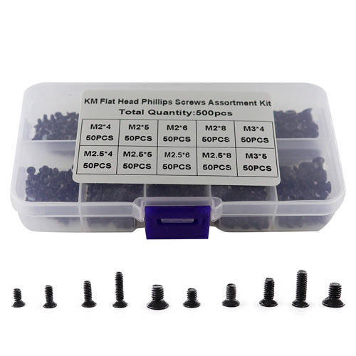 Набор крепежных элементов для использования в ноутбуках, компьютерах и другой мелкой бытовой электронике.Данный набор микровинтов поставляется в пластиковом кейсе для хранения и состоит из 500 винтов, разделенных на 10 видов (длина х диаметр):50х М2х450х М2х550х М2х650х М2х850х М2.5х450х М2.5х550х М2.5х650х М2.5х850х М3х450х М3х5Вид винтов: плоские потайныеШлиц: крестообразныйЦвет: черныйМатериал: углеродистая стальРазмер кейса: 12.8 х 6.8 х 2.3 смВес набора: 105 г