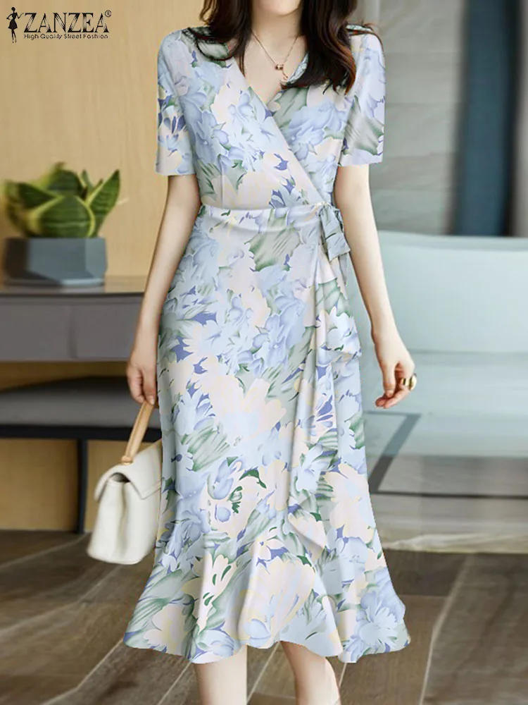 ZANZEA Elegant Wrap V Neck Midi Dress Women Floral Print Tie Side Ruffles Mermaid Dress Korean Fashion Vestido Short Sleeve Robe