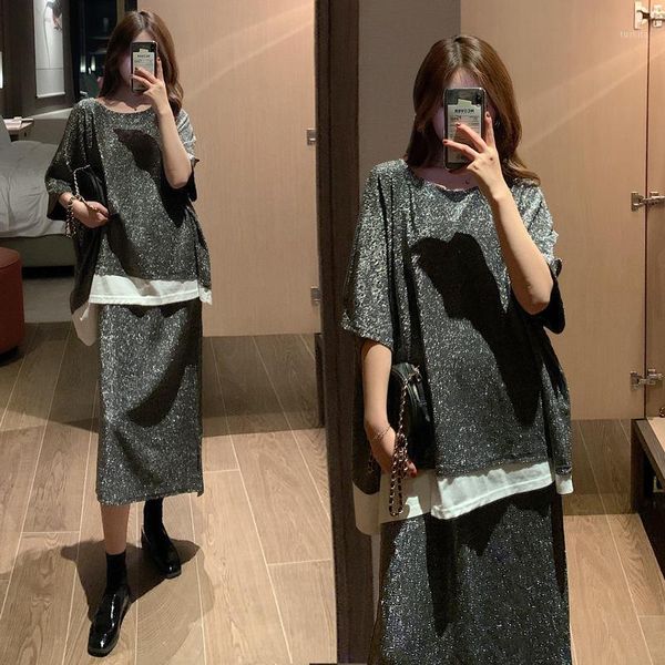 women sets summer lady t-shirt + split skirt female two-piece set fil-lumiere loose fashion plus size a0-20131, Gray