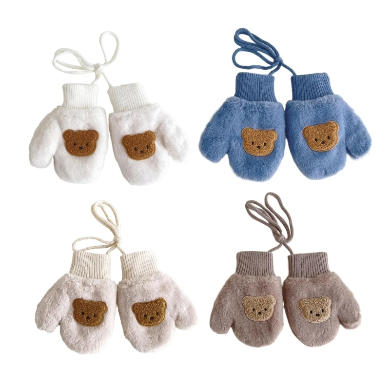 57EE теплые детские варежки с мультяшным медведем и веревкой, детские зимние толстые нескользящие варежки для мальчиков и для От