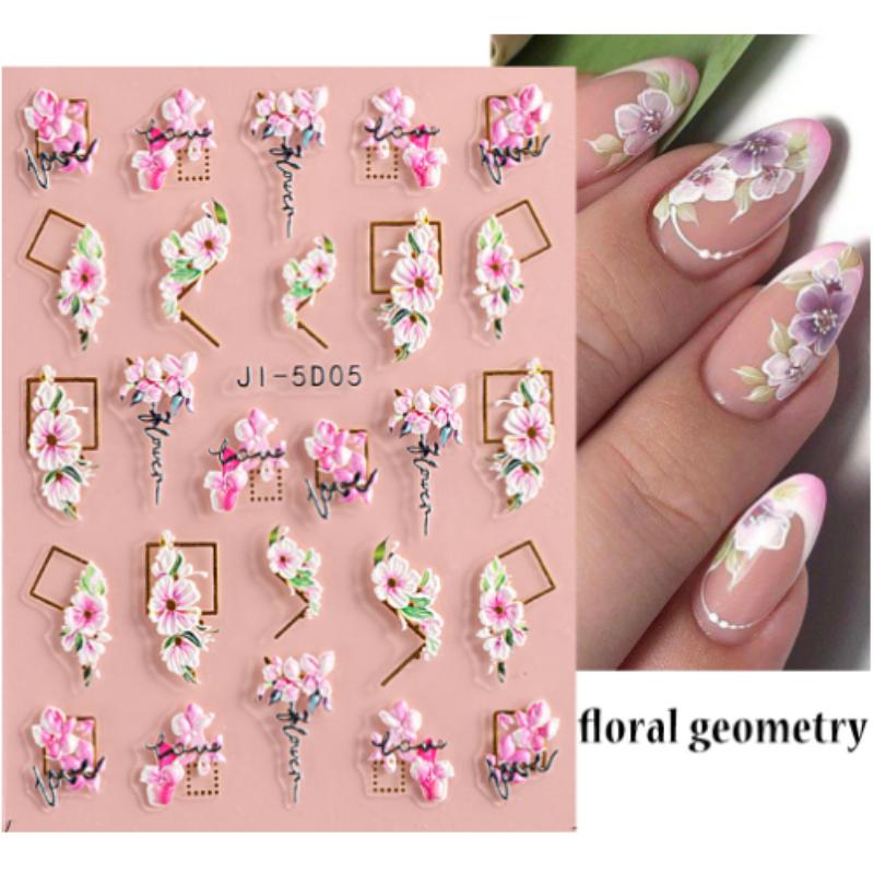 5D наклейки для ногтей цветы геометрические линии декор акриловые тисненные слайдеры золотая рамка наклейки для ногтей вишневый маникюр GLJI-5D05