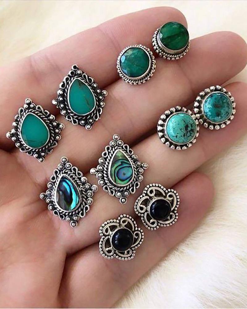 5Pair Geometric Floral Pattern Turquoise Earrings Set, Blue