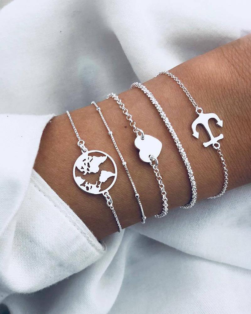 5pcs Heart Boat Anchor Pattern Layered Bracelets Set, Silver