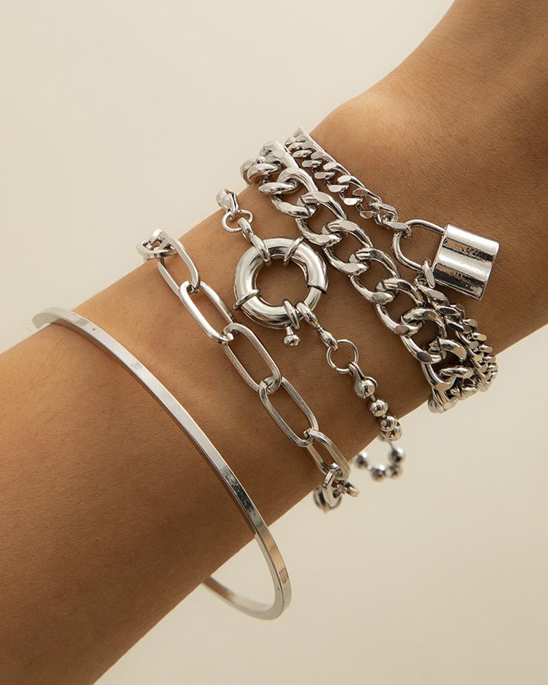 5pcs Multi-layer Geometric Lock Toggle Chain Bracelets Set, Silver