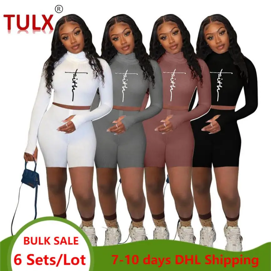 6 комплектов, оптовая продажа, женские комплекты из двух предметов, тренировочный комплект, вязаный верх с высоким воротником и шорты, повседневный женский топ и шорты 6988