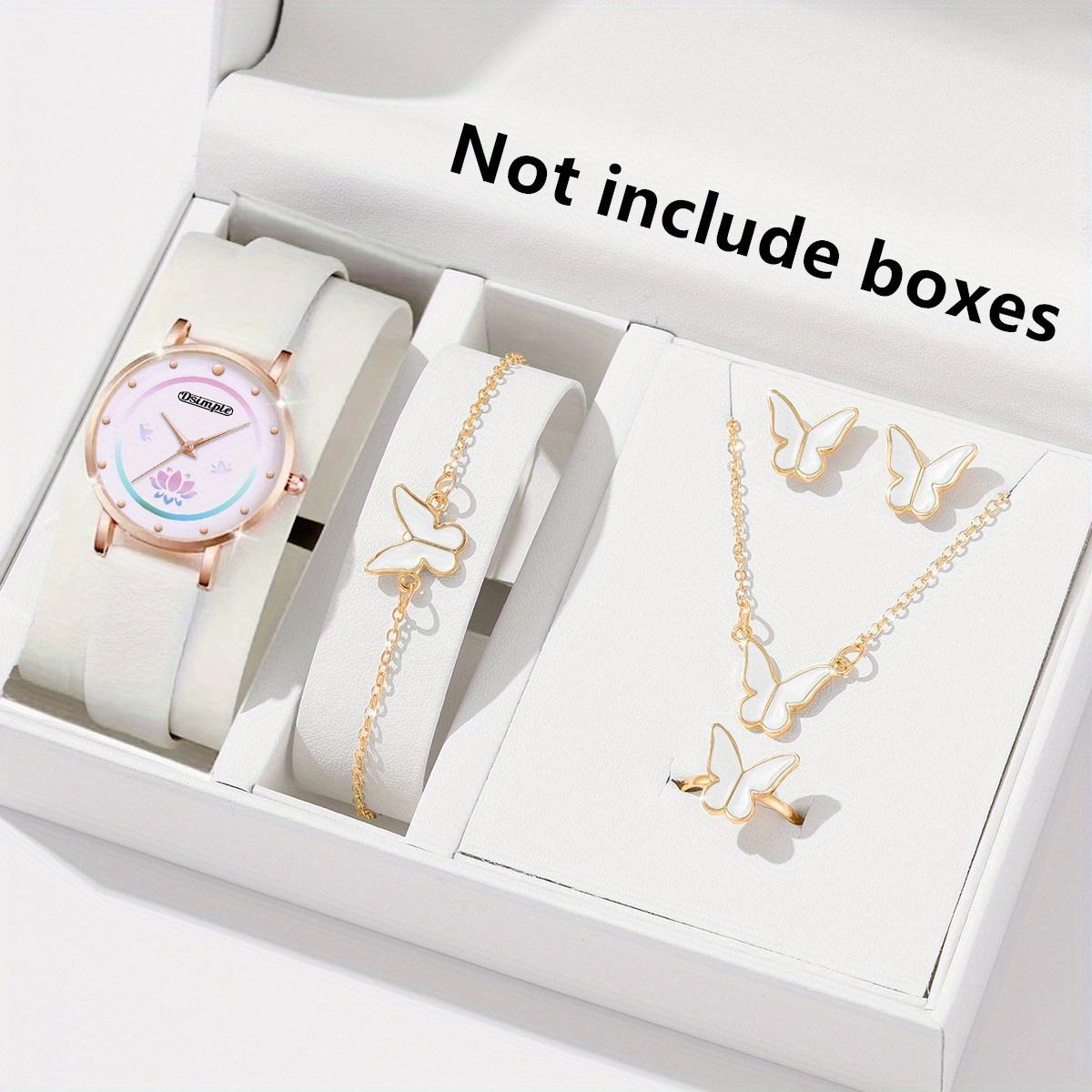 6 шт./компл. женские часы, повседневные кварцевые часы с круглой стрелкой, аналоговые наручные часы из искусственной кожи, женский браслет, ожерелье, серьги, кольцо, комплект ювелирных изделий, подарок для нее