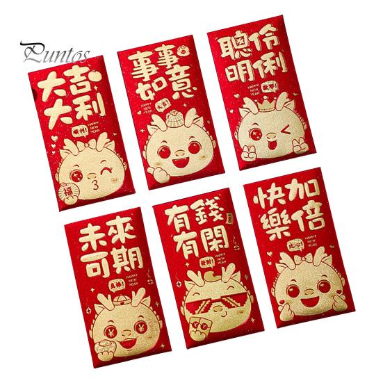 6 шт. 2024 год Дракона, красный конверт, мультяшный зодиакальный дракон и счастливые благословения, слова, узоры, счастливый бумажный кошелек для монет для детей, друзей, милый