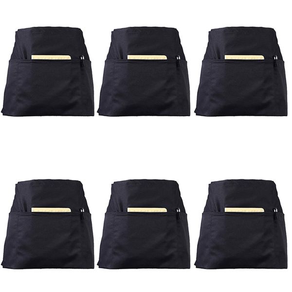 6 pack black waist aprons with 3 pockets - half aprons for waitress waiter 24 x 12 inch server aprons for holding server book gu