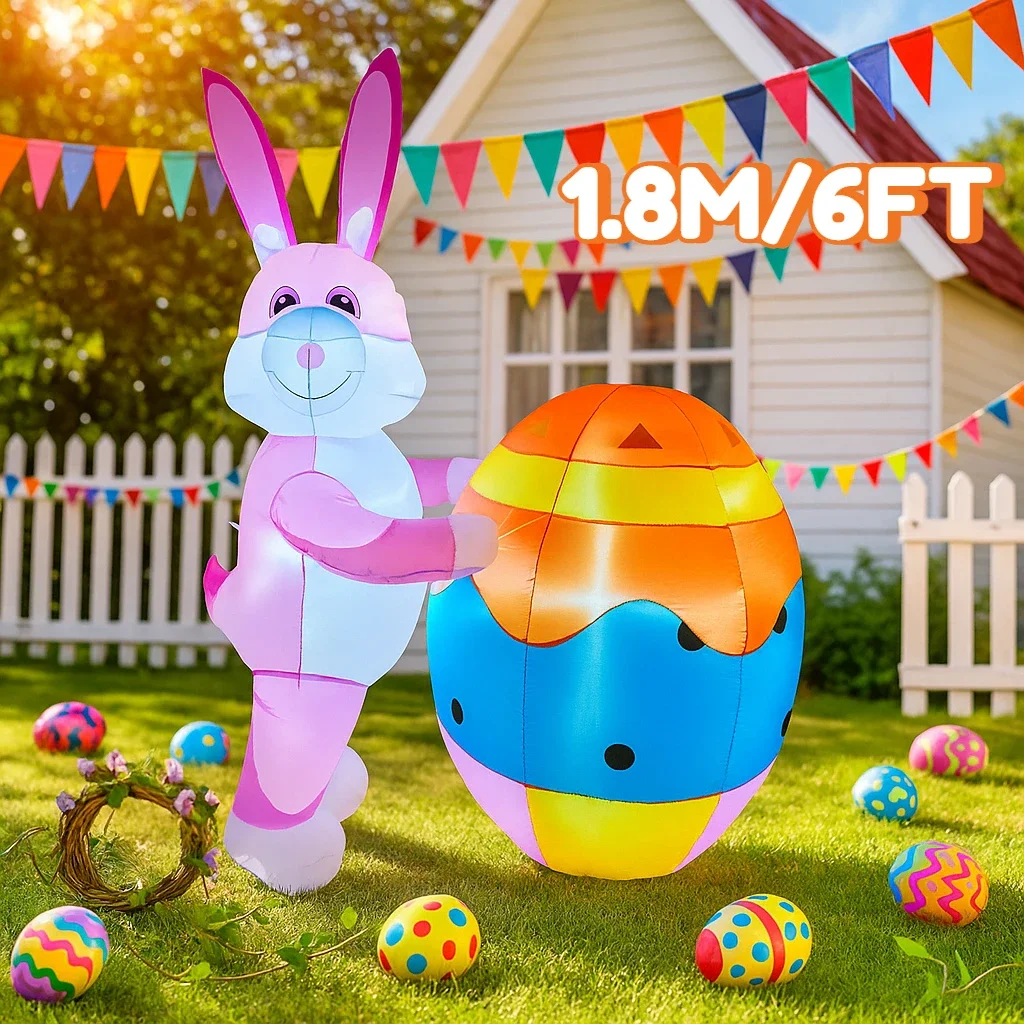 6FT Outdoor Holiday Decorations Happy Easter Inflatable Pink Rabbit And Large Egg LED Lights Decorations Easter Inflatable