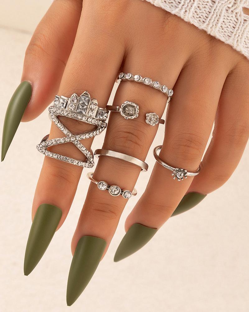 6PCS Rhinestone Decor Ring Set, Silver
