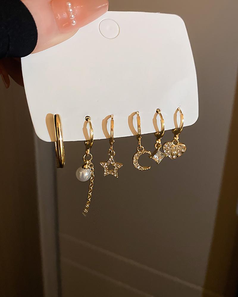 6Pair Rhinestone Moon Star Heart Pattern Hoop Earrings, Gold