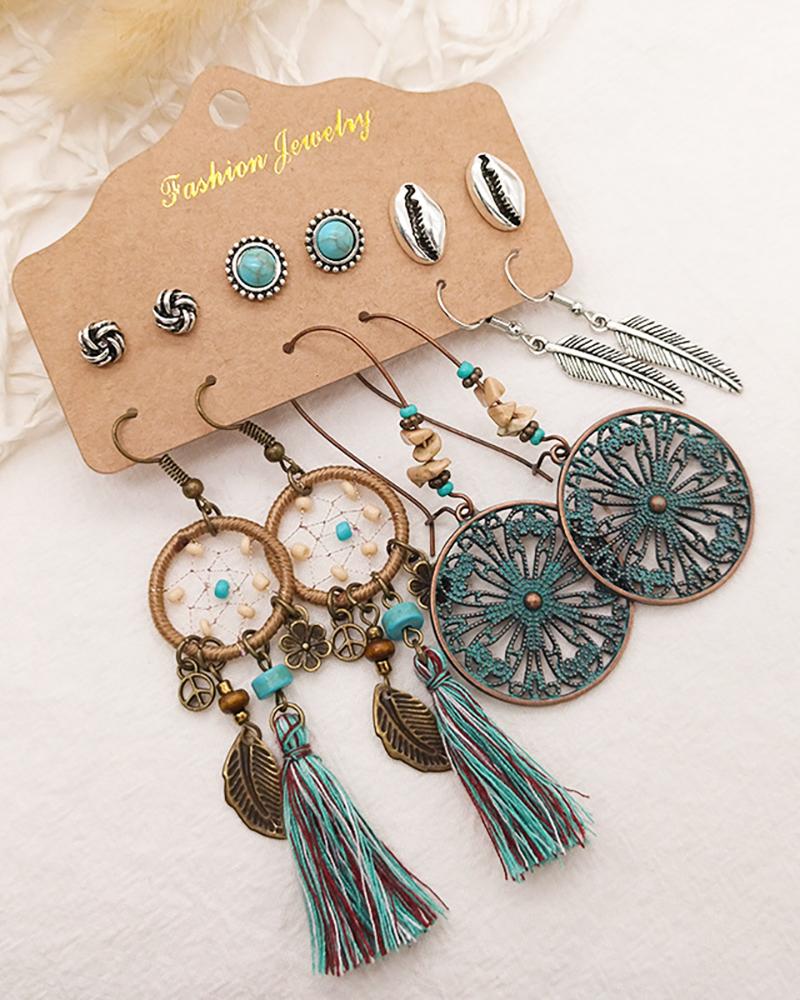 6Pairs Dreamcatcher & Feather Pattern Earrings Set, Blue