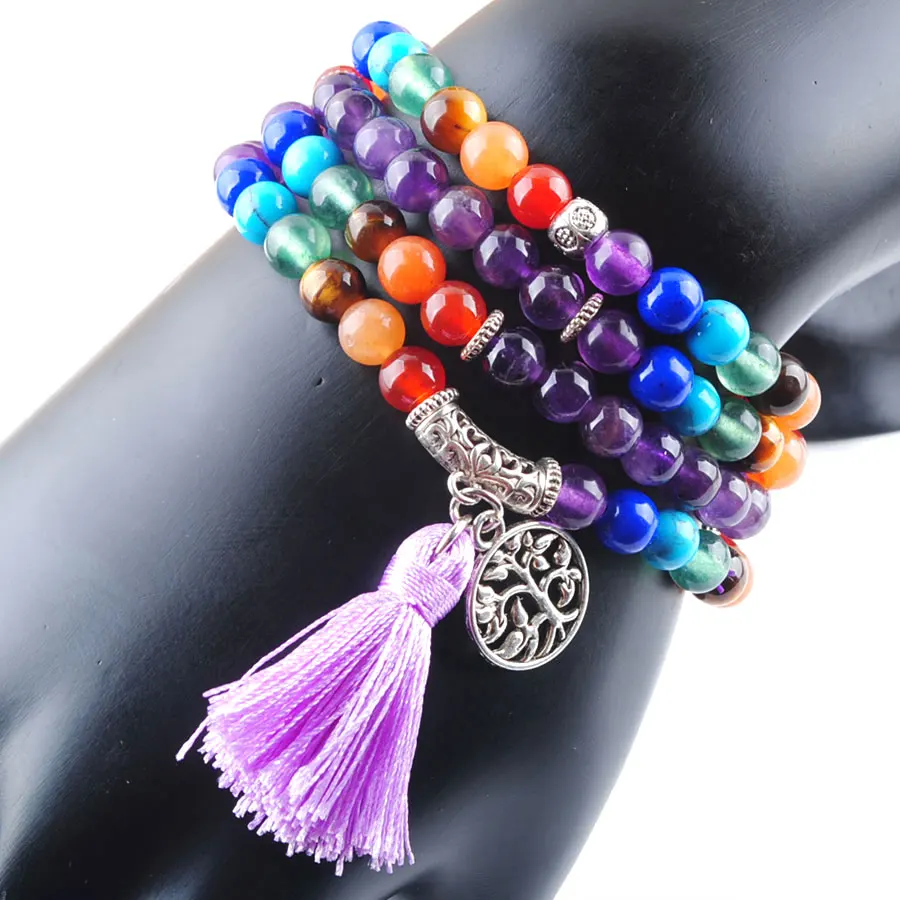7 Чакр 108 медитация Многослойные Длинные Браслеты Натуральный Аметист зернистая бусина жизни Дерево кисточка Boho ювелирные изделия PK3206
