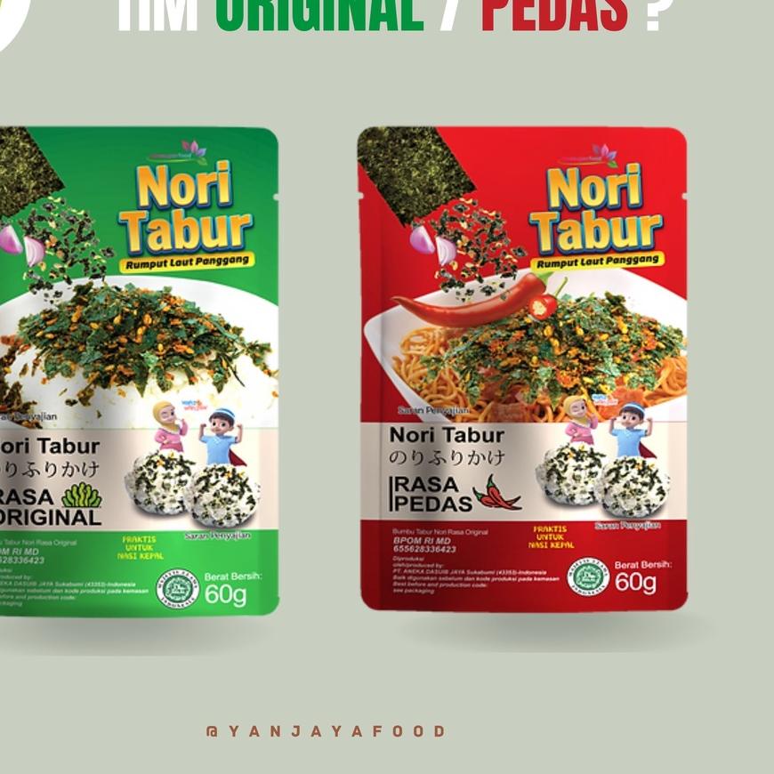 Nori Tabur ini terbuat dari perpaduan rumput laut panggang, bawang goreng dan wijen yang digunakan sebagai tambahan atau taburan untuk menu makanan.