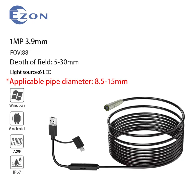 720p 3.9mm ultra-short endoscope, IP67 waterproof camera, 6 LED lights, compatible with Android and Windows systems.