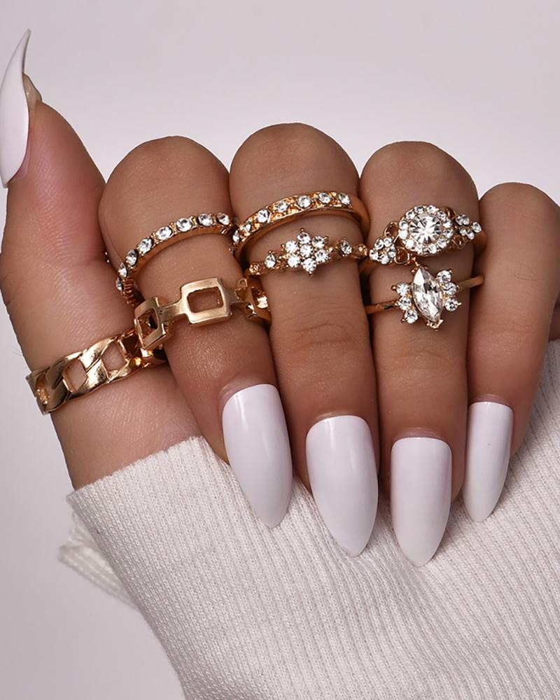 7PCS Geo Pattern Studded Rhinestone Ring, Gold
