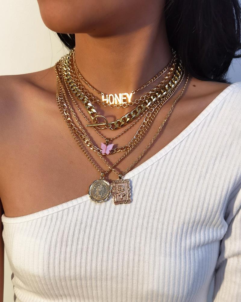 7PCS Letter & Coin Design Chain Layered Pendant Necklace Set, Gold