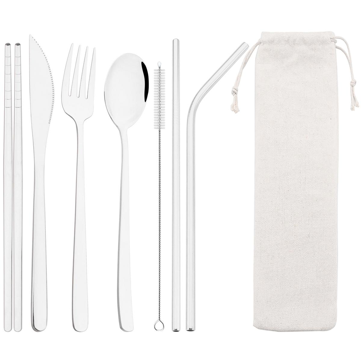 8 шт. Золотые дорожные столовые приборы Нож Вилка Ложка Палочки для еды Соломинка Столовые приборы с сумкой Зеркальная нержавеющая сталь Столовые приборы Кухонная посуда серебряный