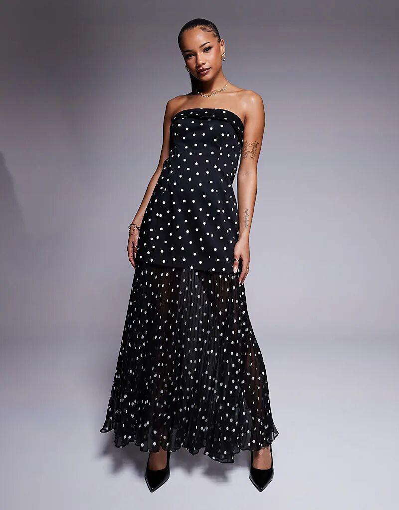 Платье мидакси Forever New Petite с плиссировкой и прозрачным верхом в черный горошек