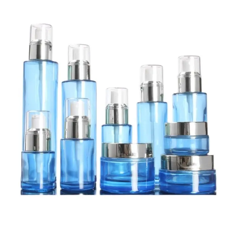 8 шт., флакон с прозрачным голубым стеклом, пустой, 120 мл, 100 мл, 60 мл, 30 мл, 20 цветов, флакон с распылителем для лосьона, банки для крема 50 г, 30 г, 20 г