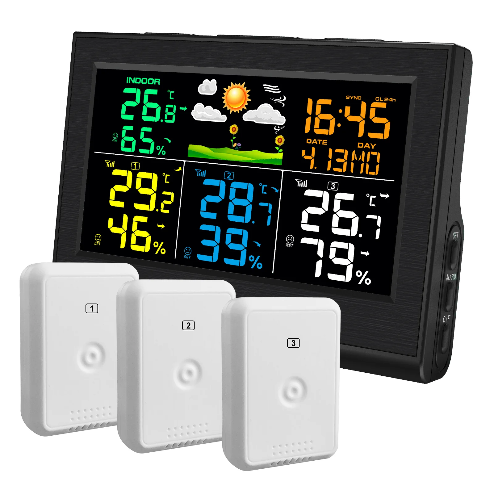 8-Channel Wireless Thermometer Hygrometer 330ft Long Range with 3 Sensors Multi-Room Monitoring Weather Forecast Alarm Calendar