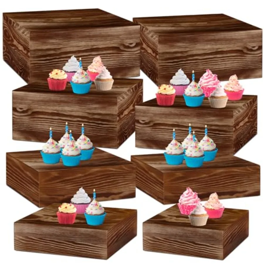 8 Pcs Large 13.7" Wood Risers Display Stands Rustic Square Cupcake Stand Food Risers Stackable Display Box for Buffet Table Dess
