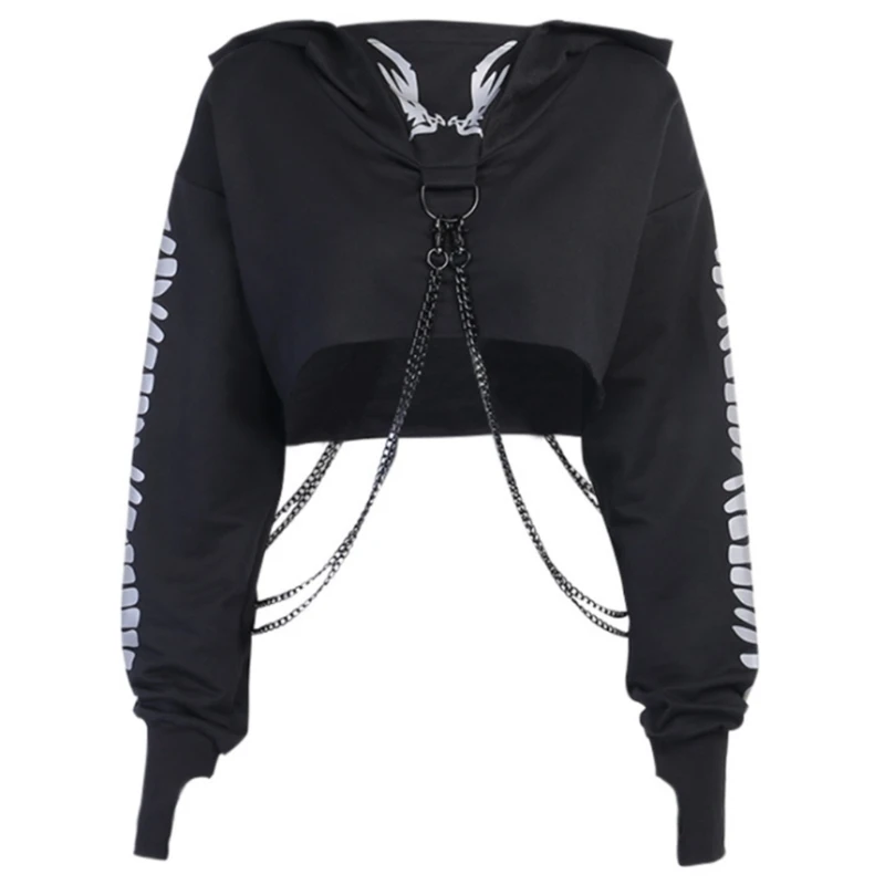 831A Женские Светоотражающие толстовки с принтом «рыбья кость», готический панк свитшот с длинным рукавом и вырезами, с цепочкой, Харадзюку, х...