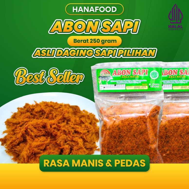 Abon Sapi Asli Solo merupakan abon yang terbuat dari bahan daging sapi pilihan dan rempah-rempah tradisional Ttanpa pengawet dan tanpa pewarna diolah secara higienis sehingga menghasilkan rasa yang gurih, nikmat dan lezat. Sangat cocok untuk dijadikan lauk pauk sehari-hari.