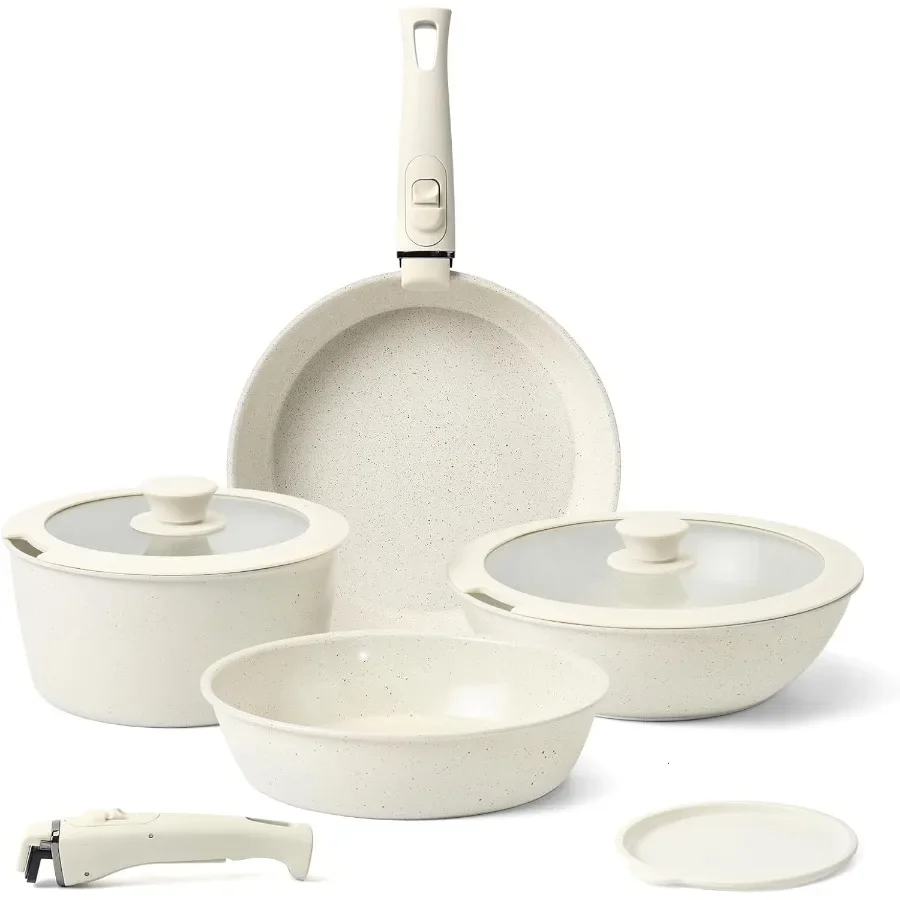 9 Pcs Ceramic Cookware Set Non Stick Frying Pots and Pans Set PFAS PFOA PTFE Free with Detachable Handle for RV Kitchen Inducti