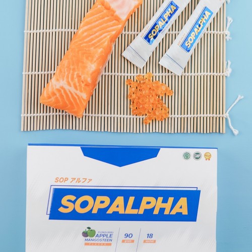 SOPALPHA adalah minuman serbuk yang sudah lulus uji labs BPOM serta segala jenis produksi ber-standar GMP dan titik kritis nya diawasi oleh HACCP. SOPALPHA juga sudah bersertifikat HALAL MUI. SOPALPHA mengandung bahan utama yang didatangkan langsung dari Jepang bernama Salmon Ovary Peptide dan juga Ekstrak Apple Stem Cell yang keduanya sudah terkenal khasiatnya. SOPALPHA bisa dikonsumsi siapa saja, terutama untuk menjaga kesehatan tubuh luar dan dalam, serta membantu penyembuhan penyakit yang disebabkan oleh penuaan (degeneratif).
