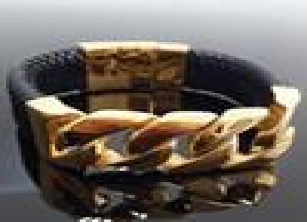 905quot24mm 100g new fashion smooth jewelry stainless steel gold curb chain mens boys bracelet bangle with genuine leather f125963541, Black