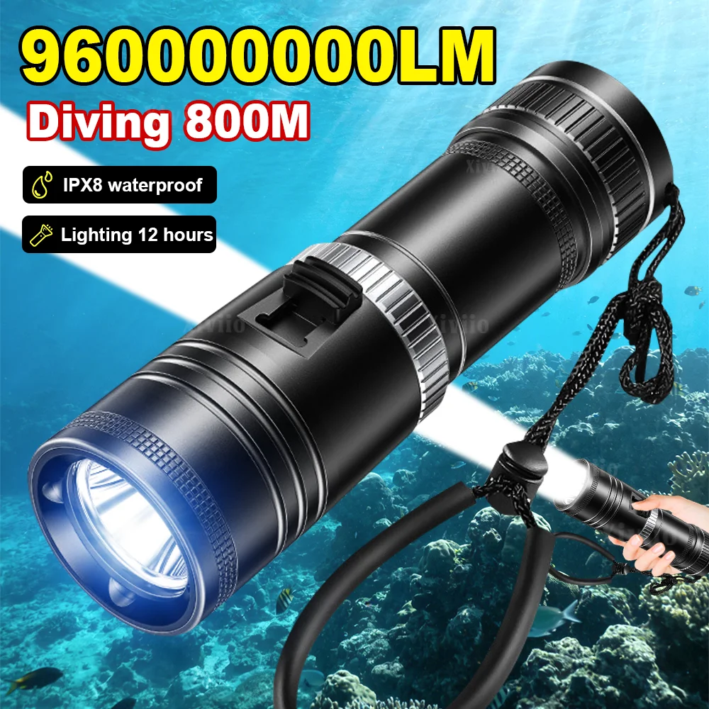 96000000LM Professional LED Diving Flashlights Super Strong Beam Underwater Torch Powerful Scuba Dive Flashlight With Hand Rope