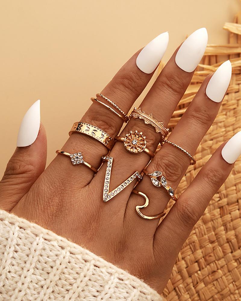 9PCS Letter & Leaf Pattern Rhinestone Rings Set, Gold