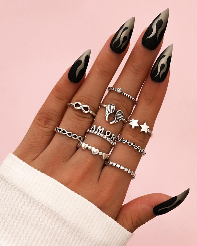 9PCS Wings & Letter & Star & Heart Pattern Rings Set, Silver