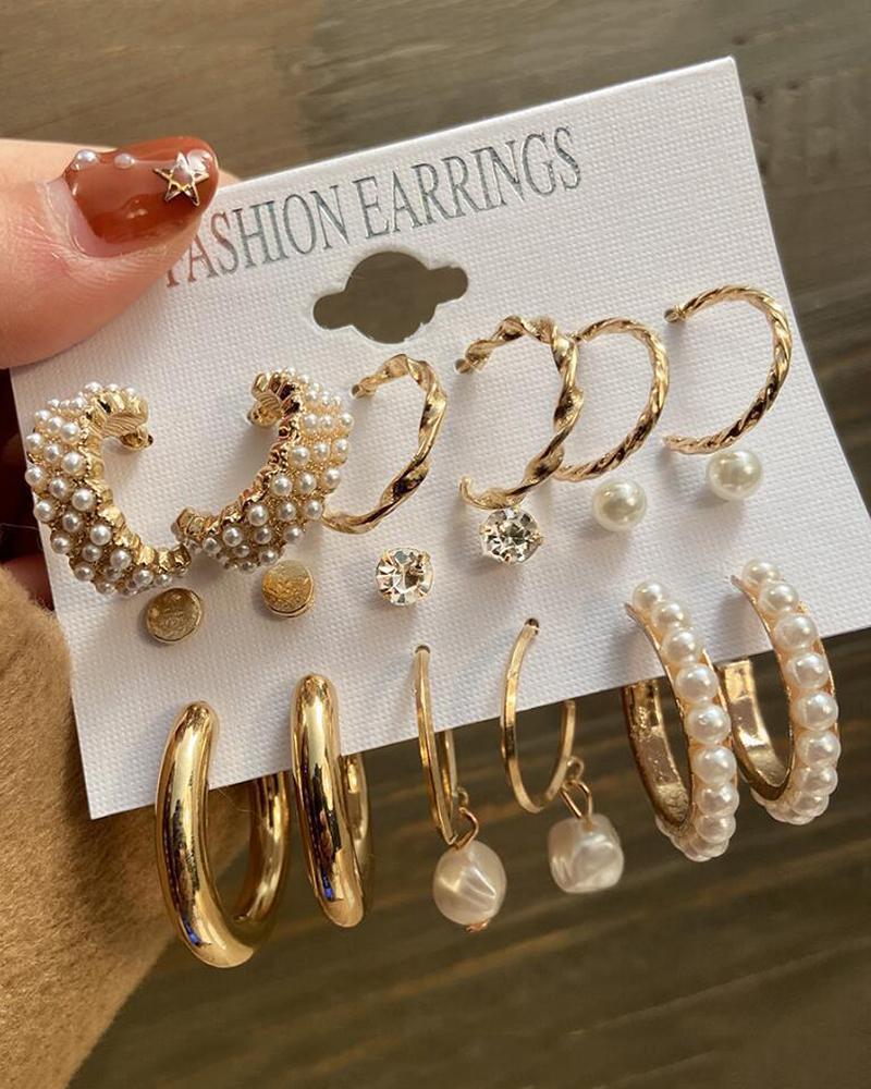 9Pairs Rhinestone Decor Hoop Earrings Set, Gold