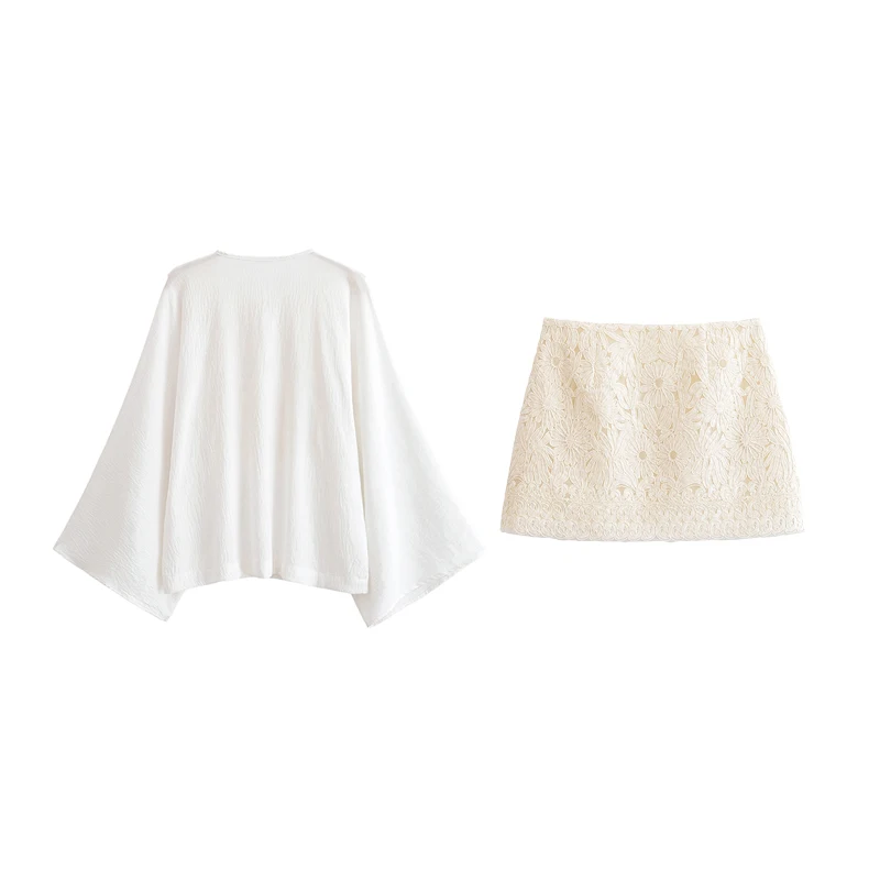 Z 2025 летний новый женский модный комплект, растворимое кружево, юбка из полиэфирного волокна, длинный свек, круглый ансамбль Ne