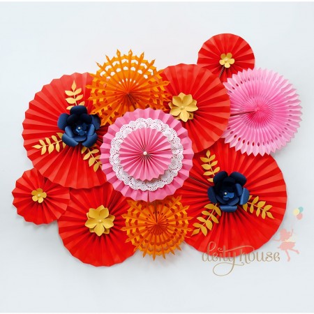 - 8" Paper Fan Medallion - Red with 3D Flower (2 pcs)